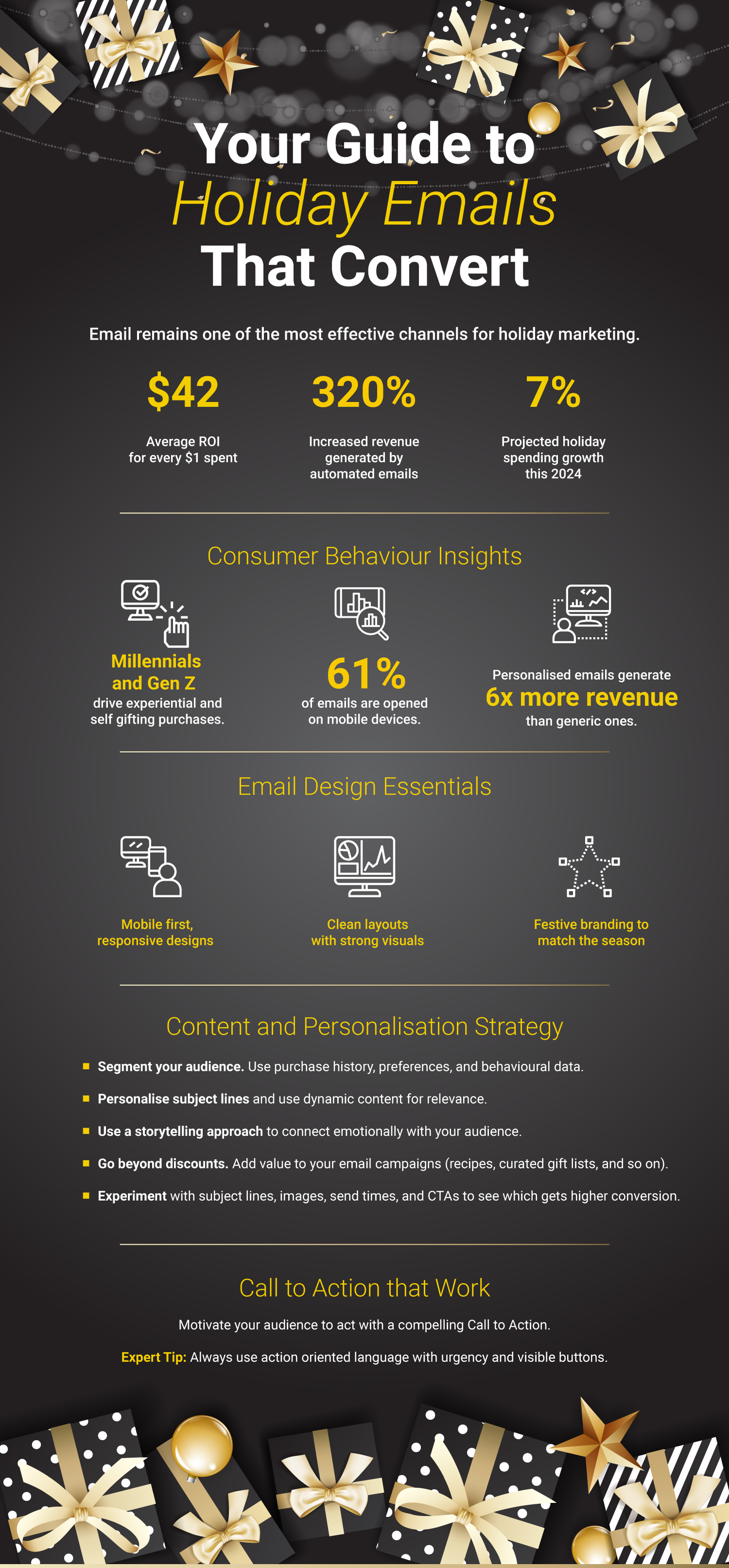 Don’t let this holiday season slip by without maximising your email marketing potential. Explore the infographic for powerful tips to engage your audience, drive engagement, spark loyalty, and boost your ROI.